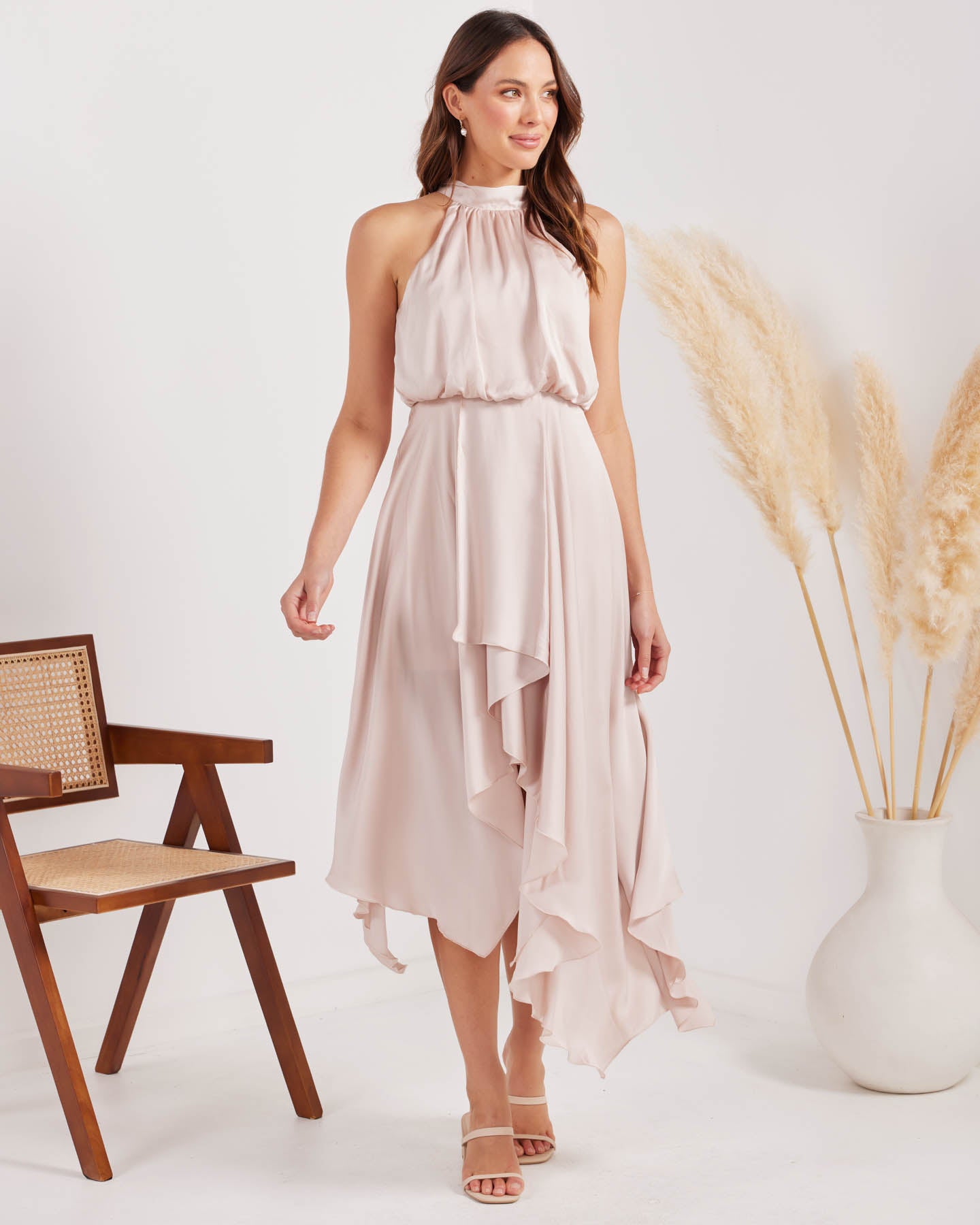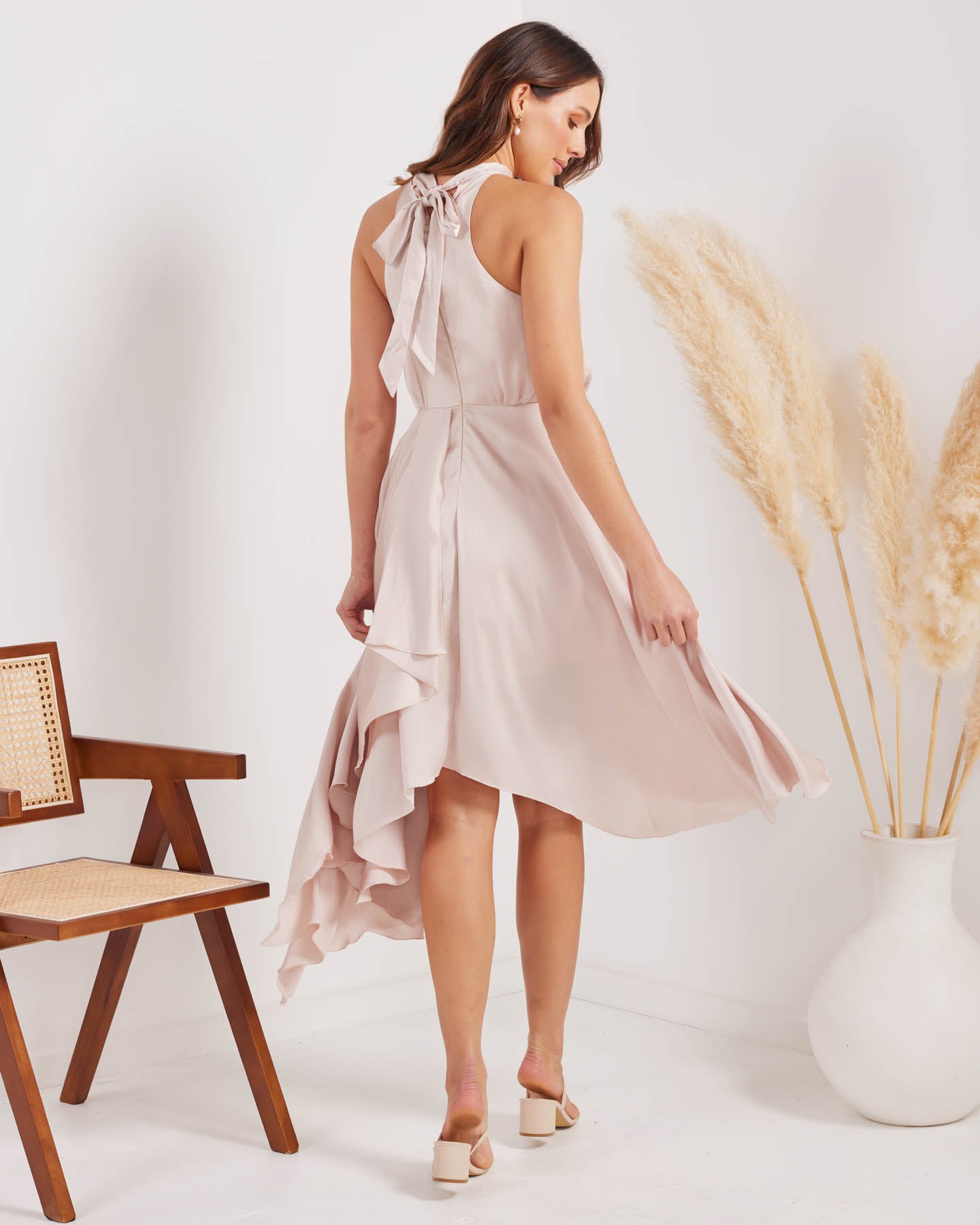 Features a flattering tie up halter neckline, cinched in waist and flowing high-low hem. This champagne formal dress is finished with a midweight satin, perfect for your bridesmaids on your special day.