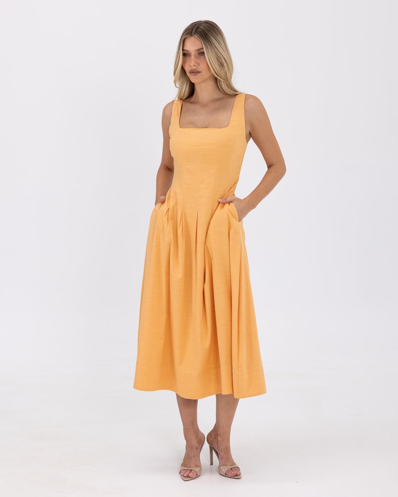 BIRDS OF PARADISE: Graceful, modern and chic, meet the Paisley Dress in gentle mango yellow – a timeless midi dress with a square neckline and pleated skirt. For an added touch of luxury, the dress features elegant stitching at the bodice and premium fabrication. Perfect for evening get-togethers with family and old friends, a day out in town, or a romantic weekend getaway.