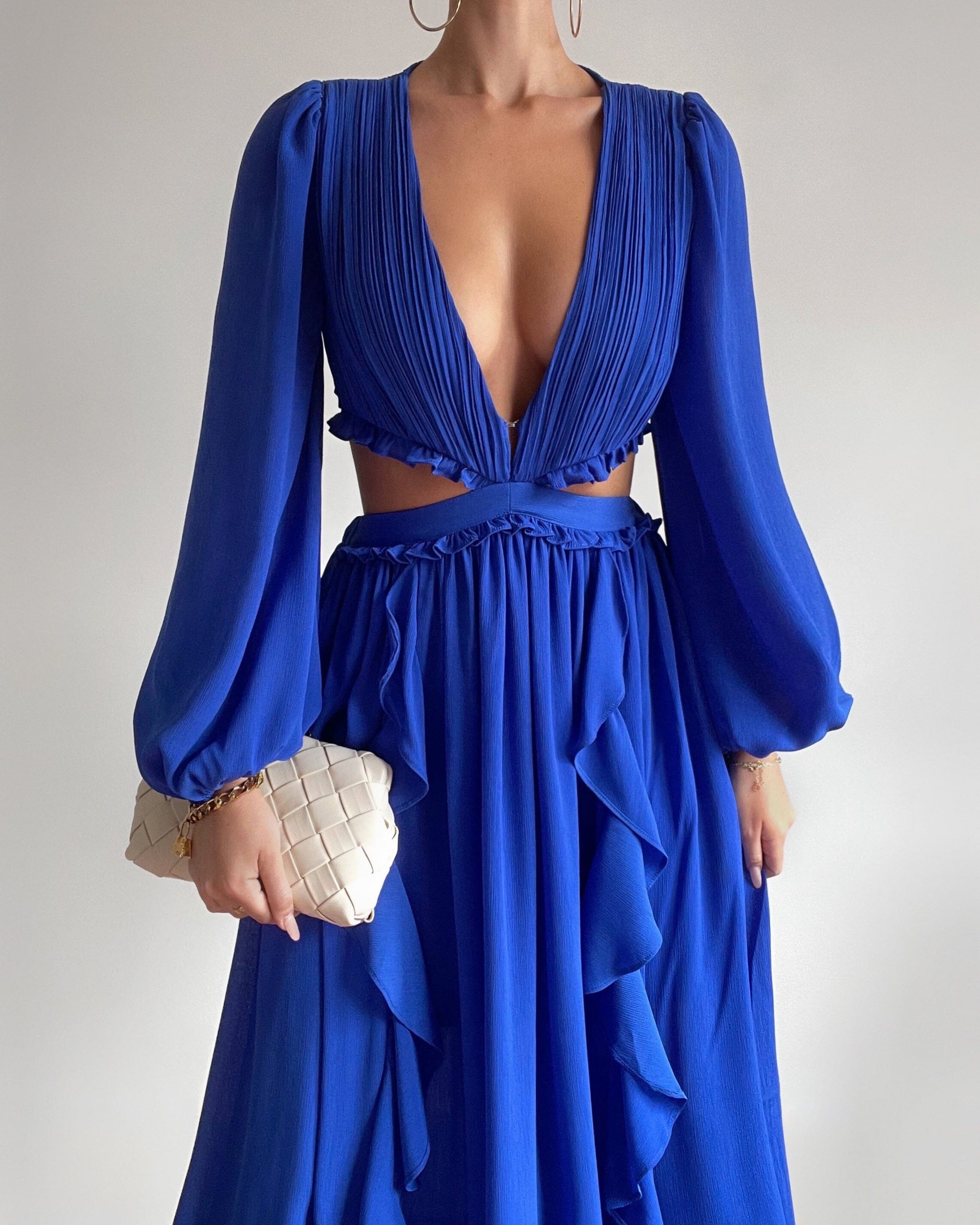Make a statement at the wedding! Our Amara Maxi Dress in cobalt blue features a waist cut out, long sleeves, and a fully shirred back for a perfect fit. Be the best-dressed guest!