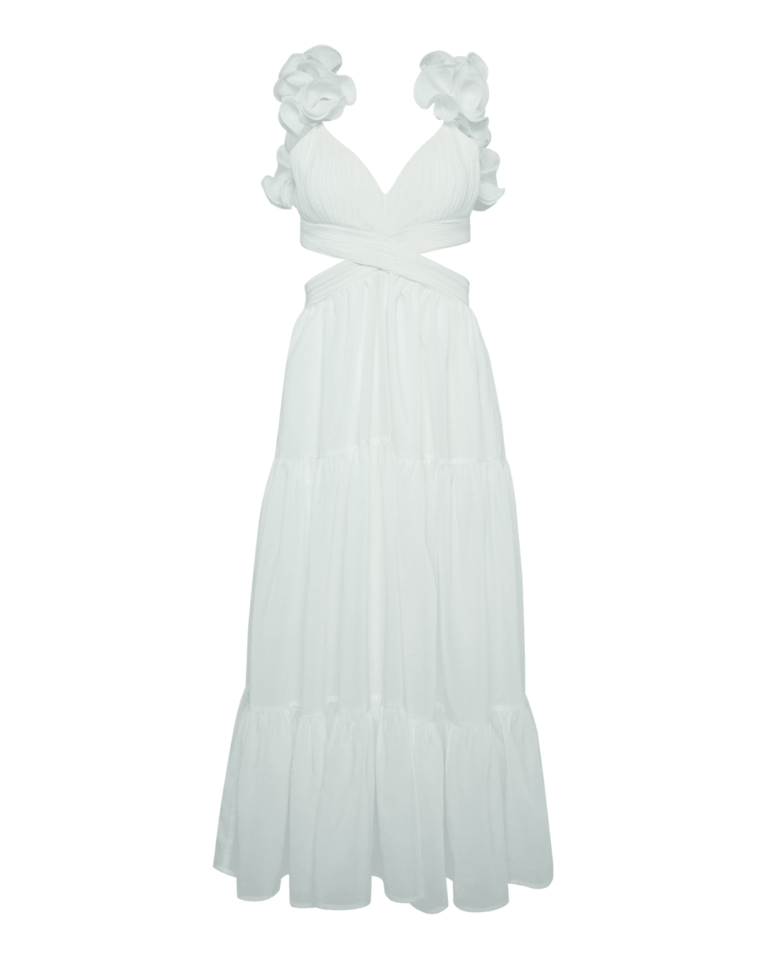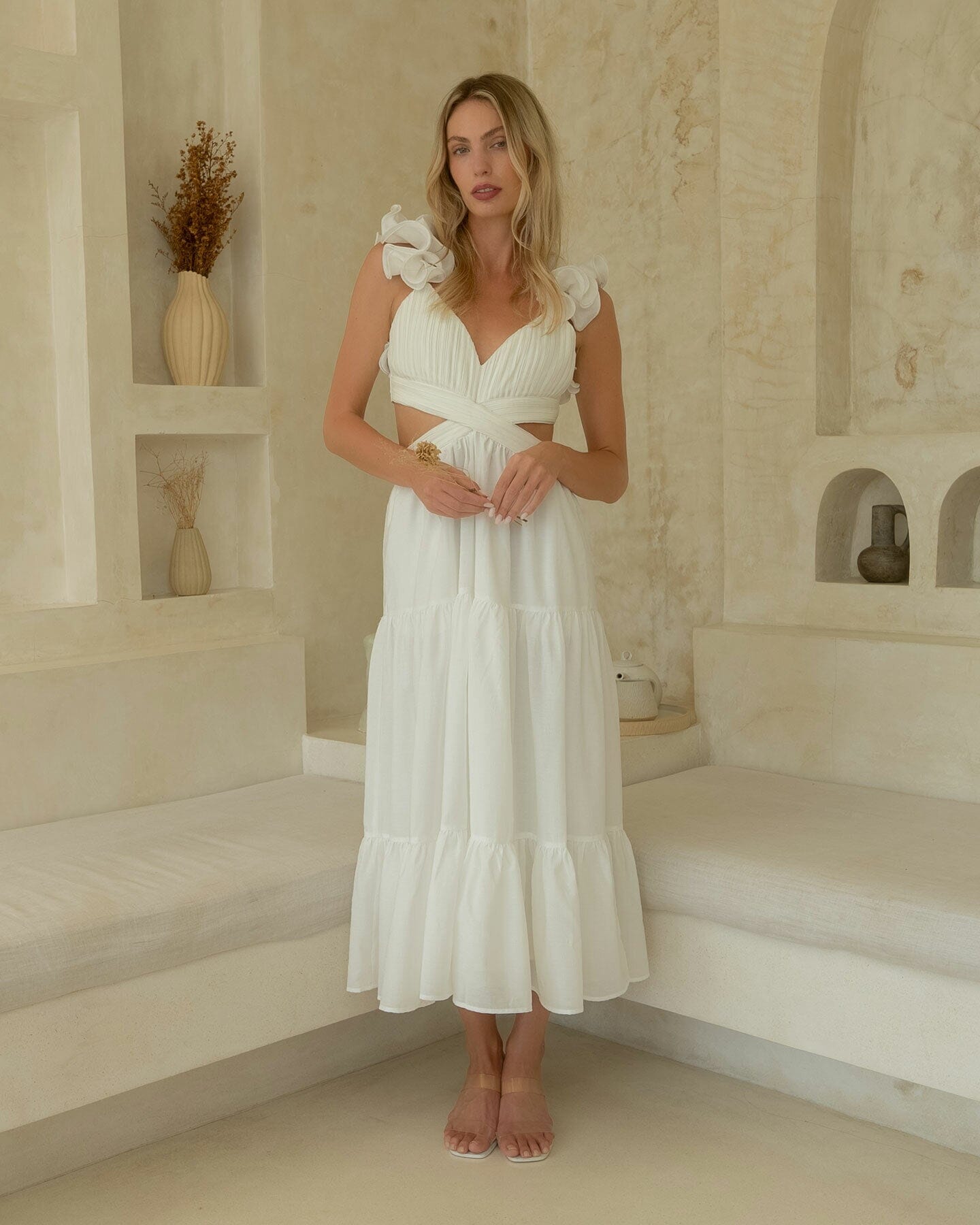 Crafted with a v neckline and a tie back detailing, the sleeveless design is finished with beautiful ruffle edging.