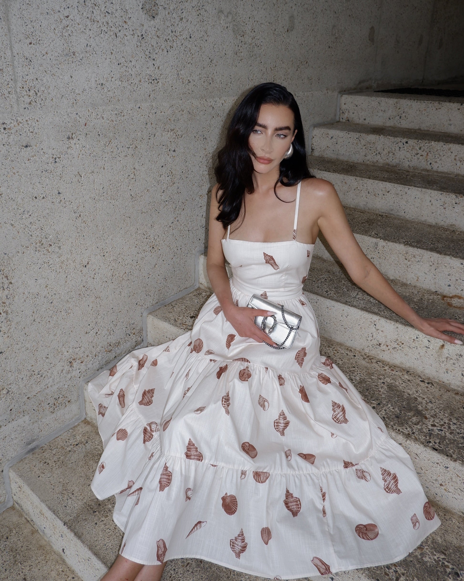 CALYPSO: The Kylie Midi Dress is the intersection of playful femininity and everyday elegance. Designed to elevate your everyday-wear, this dress is crafted with breathable fabrics, and features a flattering fit-and-flare silhouette with a signature bow-tie back detail and a tiered midi skirt that allows movement with grace.