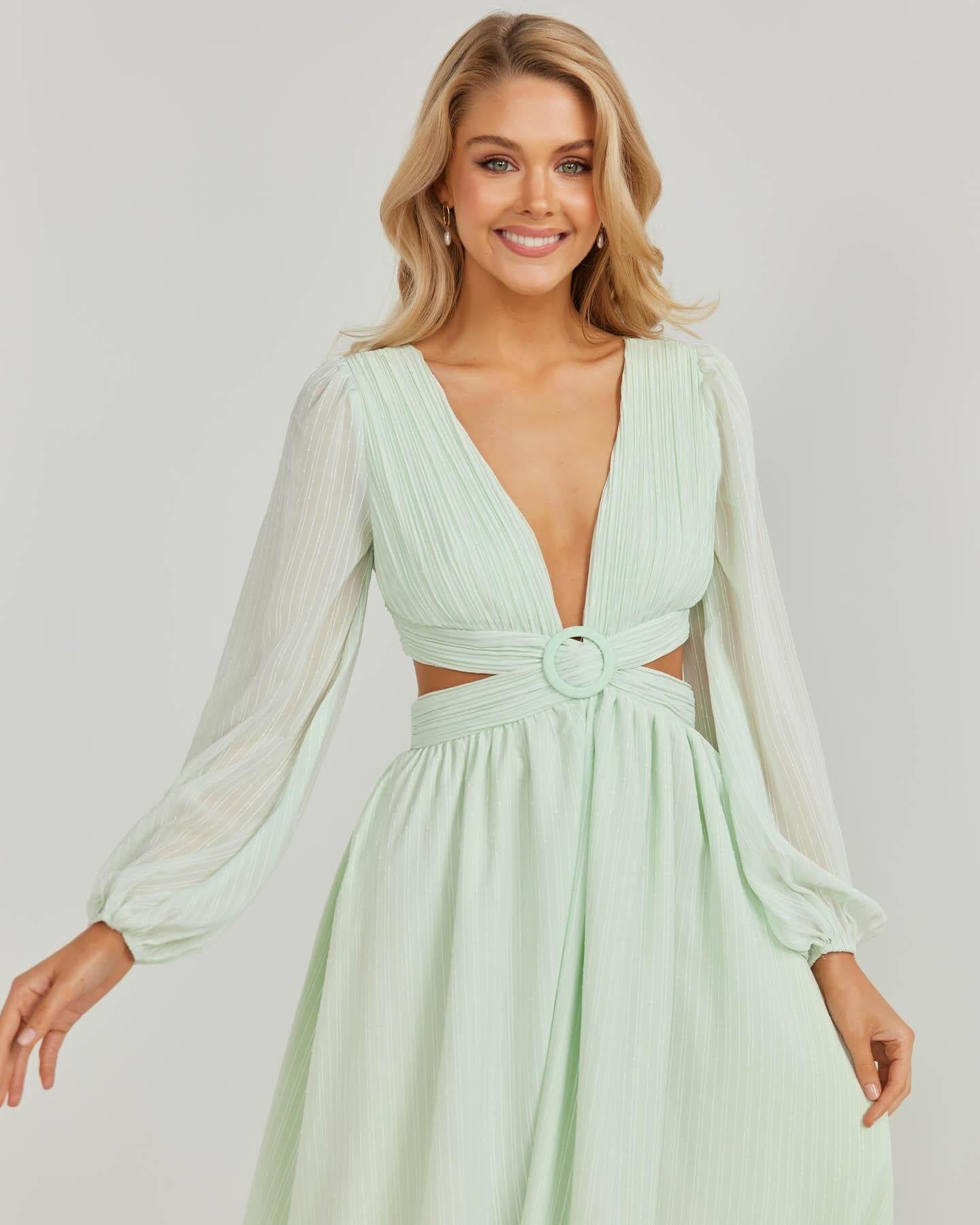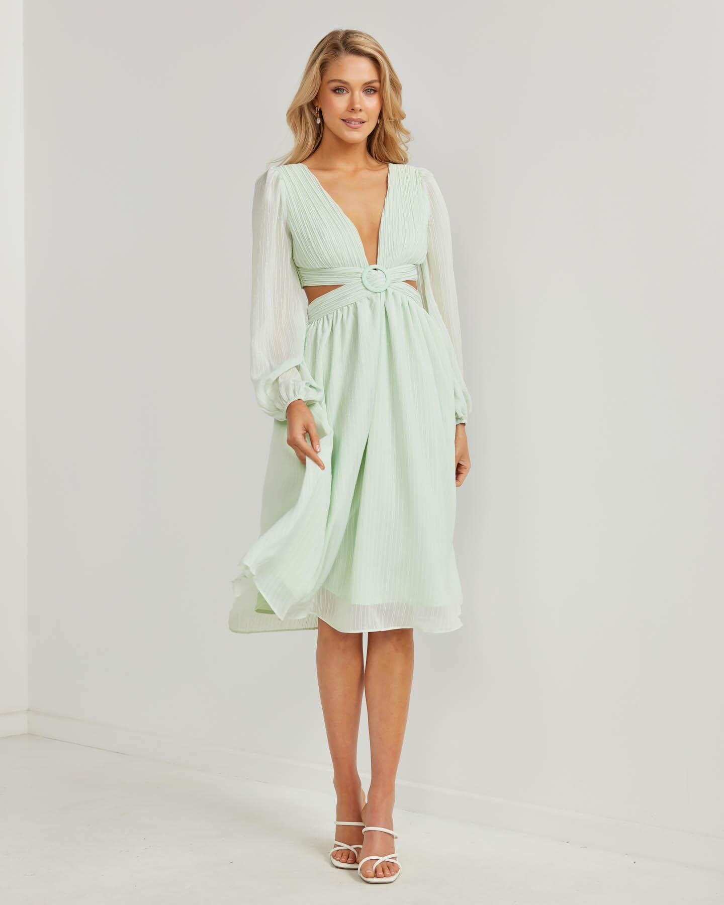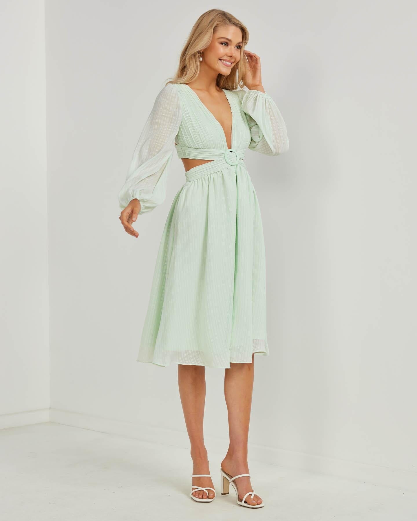 Designed with sheer balloon sleeves, a v-neckline with clasp, and waistline- enhancing cut-outs. This dress will make you the best-dressed (wedding) guest!