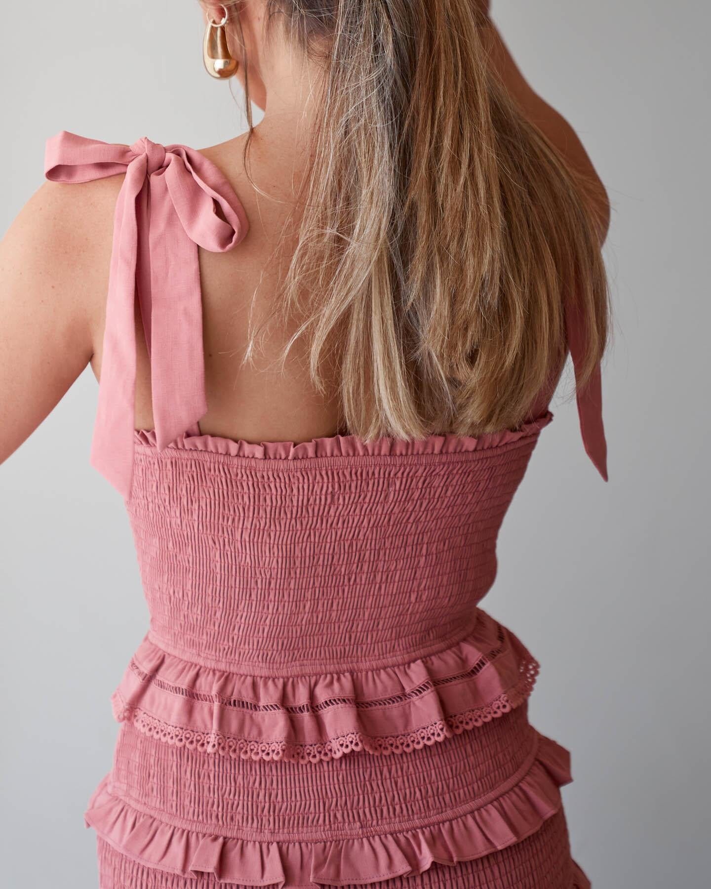 This flirty figure-hugging number is a shirred mini dress with a square neckline, tiered ruffles and ribbon straps. Style with your favourite heeled sandals to complete this look, perfect for a baby shower or birthday party!